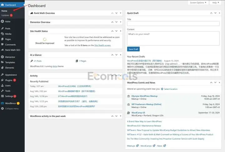 Home裏面顯示網站的活動摘要,如近期發佈的文章、近期評論、站點健康。