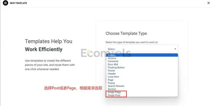 2. 點擊Add New Template。你如果是為文章新建側邊欄,就選擇Single Post;如果你想為頁面新建側邊欄,就選擇Single Page,選擇完畢以後輸入模板的名稱,進入到可視化編輯頁面。我們這邊選擇Single Post。