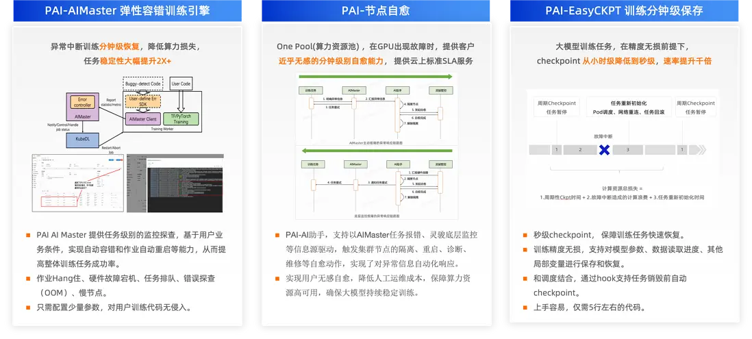高可用:通過AIMaster彈性容錯引擎、 節點自愈引擎和 EasyCKPT 大模型CKPT引擎, 實現故障節點分鐘級自愈,任務分鐘級恢復、CKPT秒級保存, 保障Ray任務持續運行, 有效降低人力和避免算力的浪費