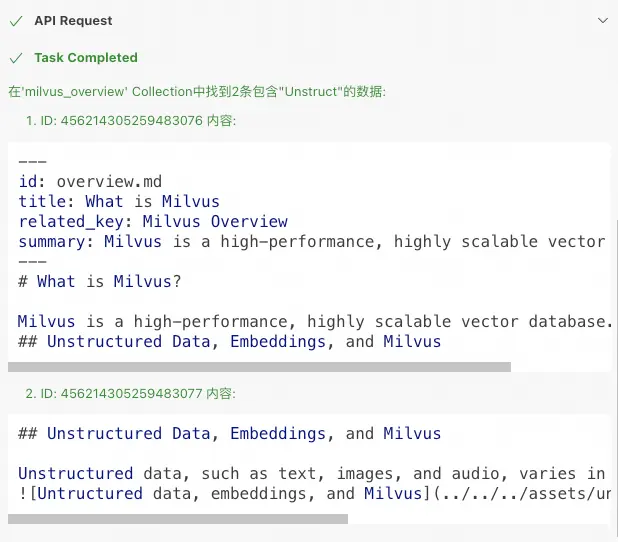 在Cline對話框中,輸入:在'milvus_overview' Collection中找到包含"Unstruct"的數據?