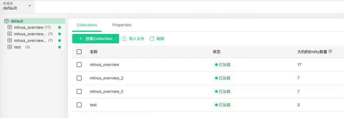 在示例Milvus集羣中,可以看到有4個Collection。