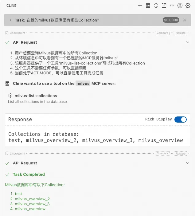 在Cline對話框中,輸入:在我的milvus數據庫裏有哪些Collection?