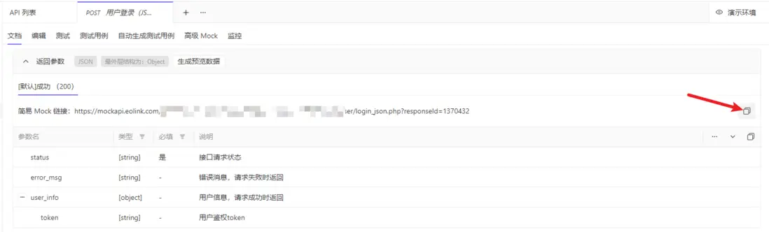 進入API文檔展示頁,下拉至返回參數模塊,則可見不同的返回結果下會有對應的簡易Mock 鏈接。