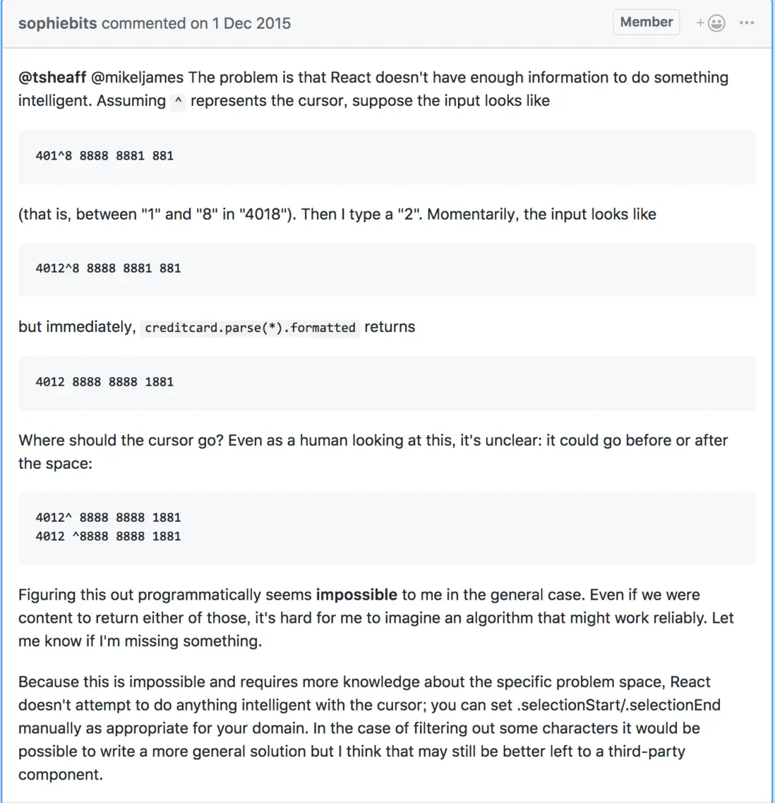 圖3 sophiebits 關於 React controlled input value 變化時光標行為的解釋