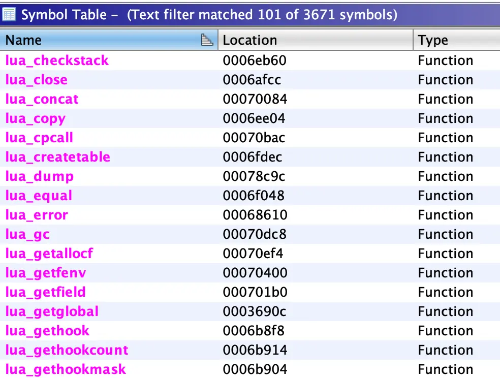 配合高強度的 so 加固,使得 Lua 虛擬機代碼不易被逆向分析。正常的 Lua 虛擬機 Native 層代碼,可以看到非常多的 Lua 接口:
