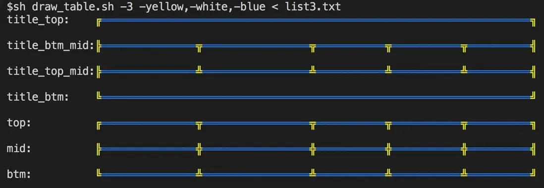在實例中,我們通過第一個參數指定style的值來選擇不同的表格形式(具體的表格形式由製表符向量tbs實現)。另外當第一個參數以-h或者--h開頭時,我們可以輸出help信息: