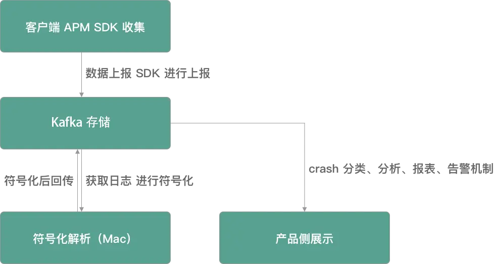 所以整個流程就是:客户端 APM SDK 收集 crash log -> Kafka 存儲 -> Mac 機執行定時任務符號化 -> 數據回傳 Kafka -> 產品側(顯示端)對數據進行分類、報表、報警等操作。