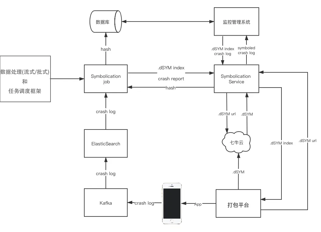 現在很多架構設計都是微服務,至於為什麼選微服務,不在本文範疇。所以 crash 日誌的符號化被設計為一個微服務。架構圖如下