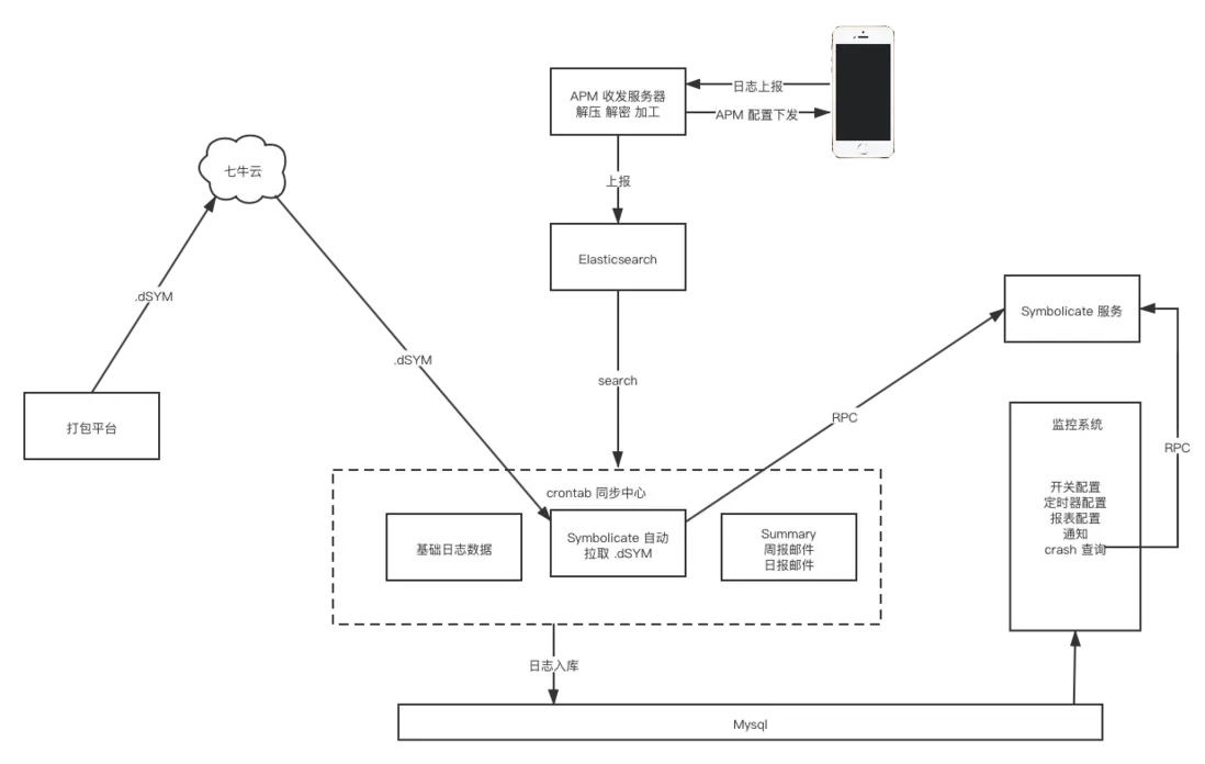 - 接收來自 APM 管理系統的包含原始 crash report 和 DSYM index 的請求,從七牛拉取對應的 DSYM,對crash report 做符號化解析,並將符號化的 crash report 響應給 APM 管理系統。
