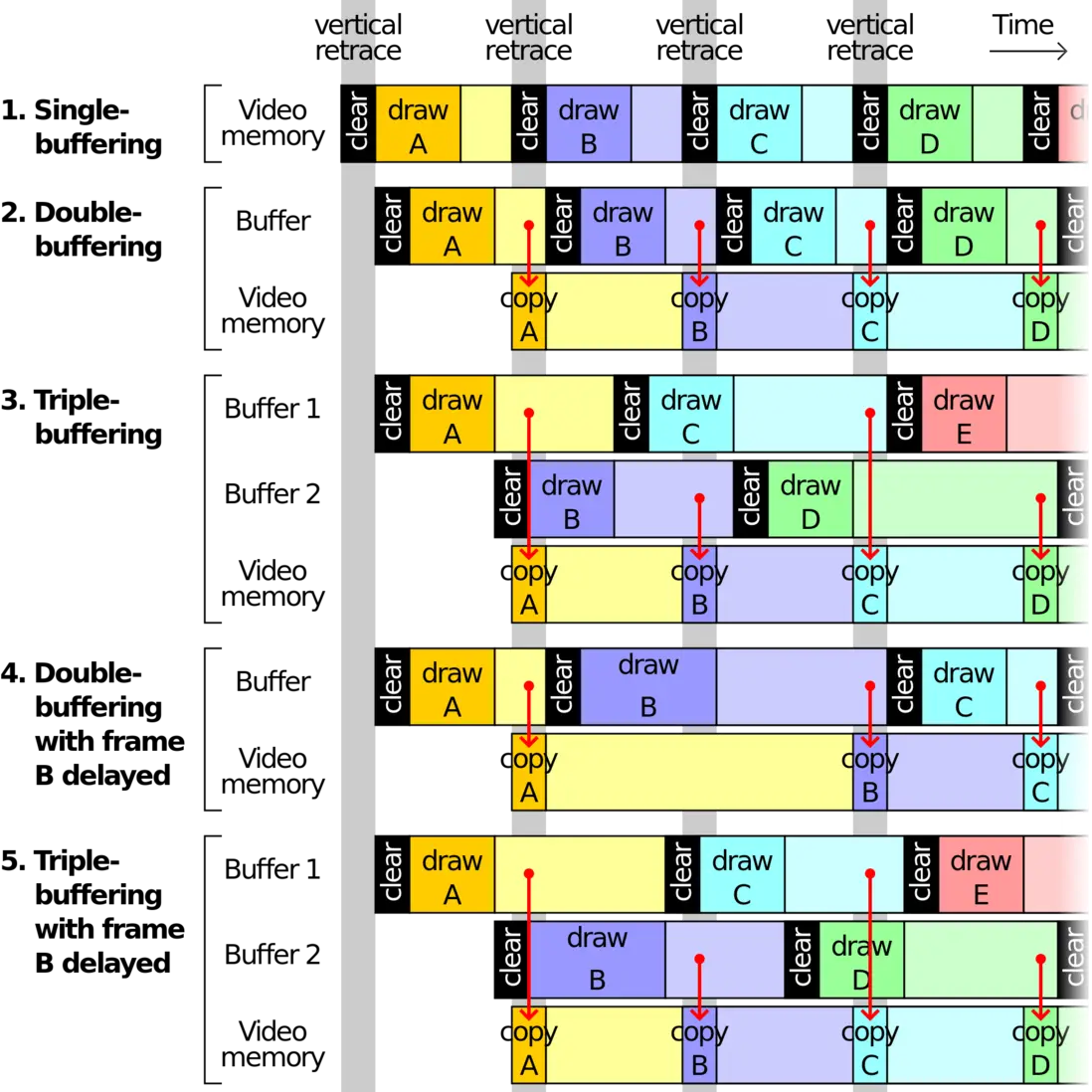 設想一個顯示器顯示第一幀圖像和第二幀圖像的過程。首先在雙緩衝區的情況下,GPU 首先渲染好一幀圖像存入到幀緩衝區,然後讓視頻控制器的指針直接直接這個緩衝區,顯示第一幀圖像。第一幀圖像的內容顯示完成後,視頻控制器發送 V-Sync 信號,GPU 收到 V-Sync 信號後渲染第二幀圖像並將視頻控制器的指針指向第二個幀緩衝區。