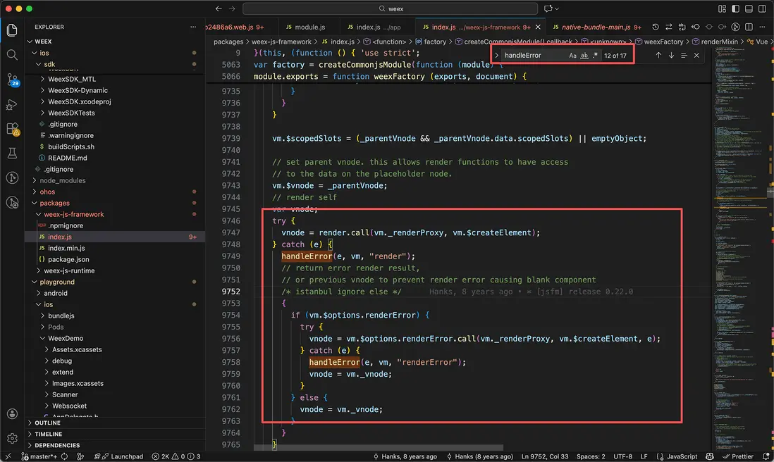Weex 底層依靠 Vue 實現,差異化就是 VM 去通過 Bridge 在 WeexSDK Native 去做繪製。異常方面除了常規的 JS 運行時異常(如語法錯誤、類型錯誤等 7 種),Vue 框架自身的邏輯層、編譯層、響應式系統、組件生命週期 等環節會拋出專屬異常,這些異常必須通過 Vue.config.errorHandler 兜底。