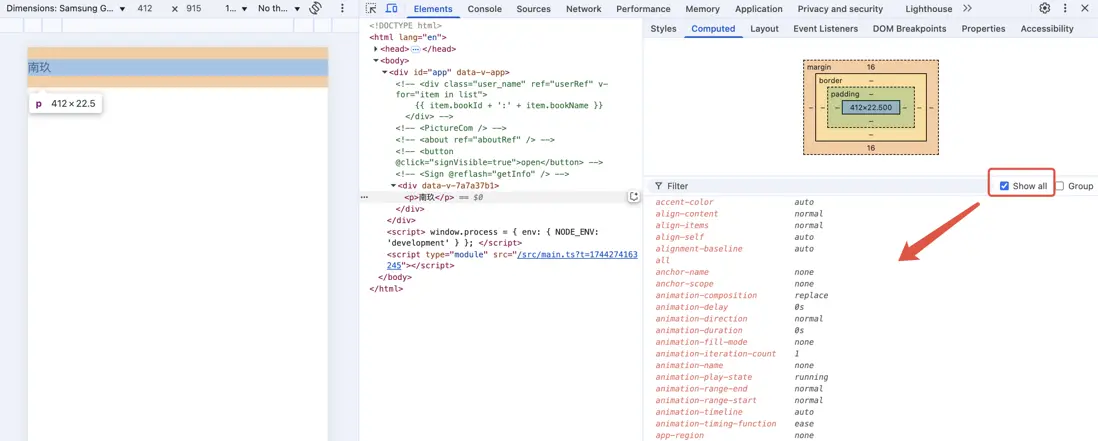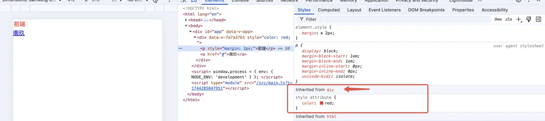 同樣還是上面的代碼,我們可以看到對於p標籤我們既沒有聲明他的文字顏色,用户代理樣式表同樣也沒聲明文字顏色,那麼它的紅色是從哪來的呢?