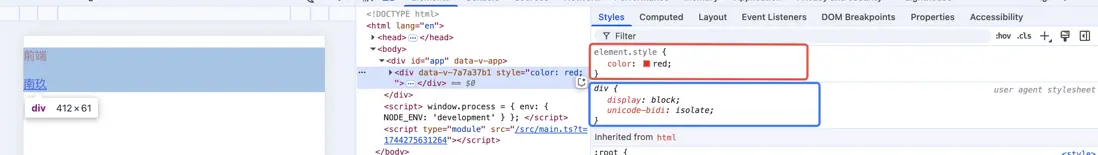 當前div既有開發者自定義聲明樣式(紅框)也有用户代理樣式(藍框),這兩塊都屬於聲明值。