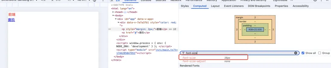 代碼同上,比如還是p標籤,我們沒有自定義聲明它的font-size,用户代理樣式表也同樣沒有聲明,它的父級元素同樣沒有聲明,這也就説明對於font-size來説既沒有聲明值也沒有繼承值,那它最終渲染是按多大的字號來呈現的呢?