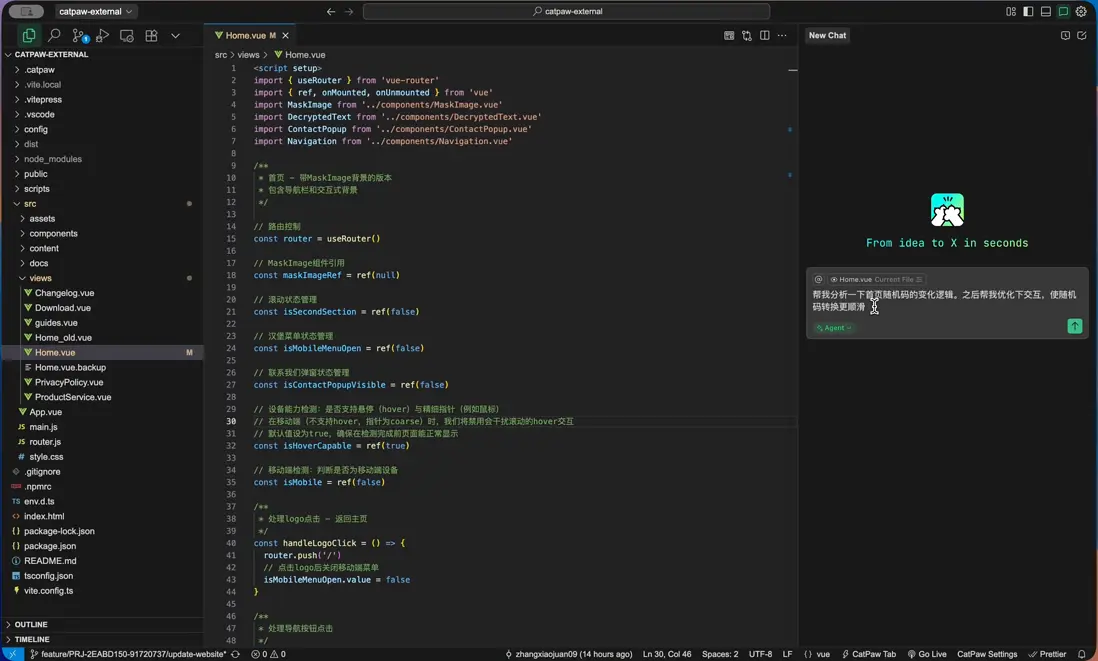 Meituan CatPaw 是美團推出的 AI IDE,通過 Agent 驅動編程體驗革新,讓開發者專注於創意實現,提升項目交付效率。簡單來説,作為 AI 編程夥伴,Meituan CatPaw 不僅能夠解答代碼疑問,更能完成複雜的開發任務,讓每一個創意都能快速實現。今天,從用户的角度來簡單聊聊CatPaw!