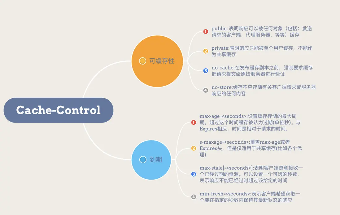 public: 表明響應可以被任何對象(包括:發送請求的客户端,代理服務器,等等)緩存,即使是通常不可緩存的內容(例如,該響應沒有max-age指令或Expires消息頭)。private: 表明響應只能被單個用户緩存,不能作為共享緩存(即代理服務器不能緩存它)。私有緩存可以緩存響應內容。no-cache: 在發佈緩存副本之前,強制要求緩存把請求提交給原始服務器進行驗證。no-store: 緩存不應存儲有關客户端請求或服務器響應的任何內容。max-age: 設置緩存存儲的最大週期,超過這個時間緩存被認為過期(單位秒)。與Expires相反,時間是相對於請求的時間。s-maxage: 覆蓋max-age或者Expires頭,但是僅適用於共享緩存(比如各個代理),私有緩存會忽略它。max-stale: 表明客户端願意接收一個已經過期的資源。可以設置一個可選的秒數,表示響應不能已經過時超過該給定的時間。min-fresh: 表示客户端希望獲取一個能在指定的秒數內保持其最新狀態的響應。