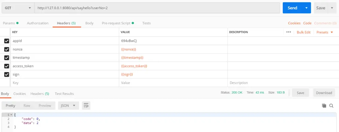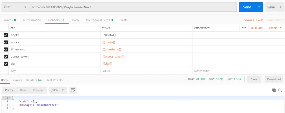 調用登錄接口獲取token後,再調用 http://127.0.0.1:8080/api/sayhello?userNo=2,返回結果正常。