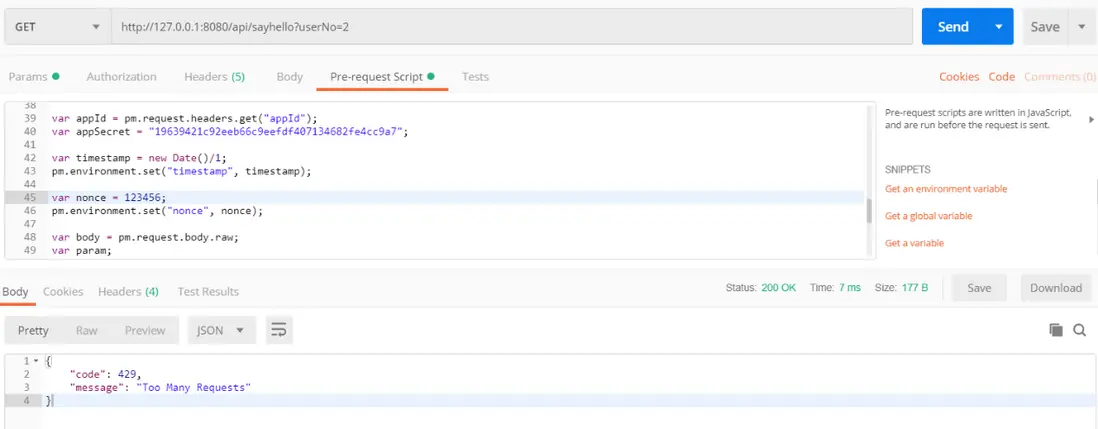 在Postman的Pre-request Script中將nonce寫死為123456,首次請求成功,再次請求則報錯“Too Many Requests”,即多次nonce送值相同時,識別出重放攻擊。