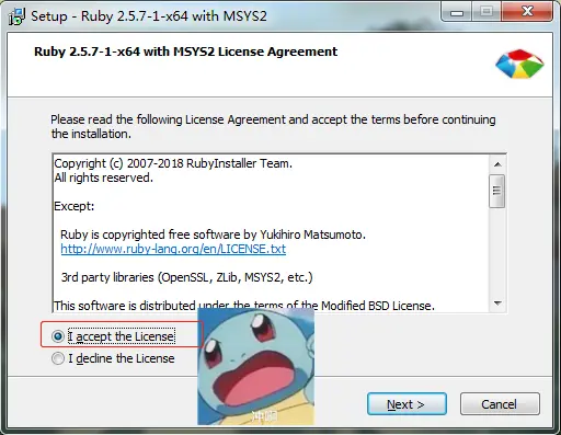 1. 雙擊打開軟件(rubyinstaller-devkit-2.5.7-1-x64)