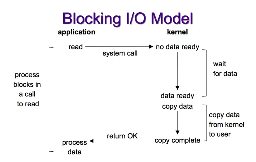 - 特點:應用程序發起I/O操作後會被掛起,直到數據準備就緒並被複制到應用程序的緩衝區中,此期間應用程序無法執行其他任務🚦。