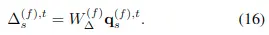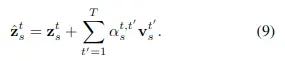其中的相似度矩陣\( {\boldsymbol{\alpha}}_{s}^{t, t^{\prime}} \in R^N \)與之前的計算方式不同,而是根據查詢點特徵和運動嵌入特徵計算而來的,公式如下: