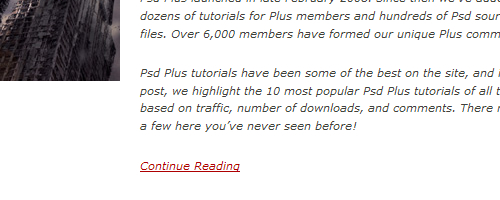 By far the most popular method of presenting “Read more” links is with simple text. This is usually done with a link that is underlined, bolded, brightly colored and sometimes marked with a > sign. Making text links on your website easily distinguishable from generic links is important and sometimes overlooked by designers.