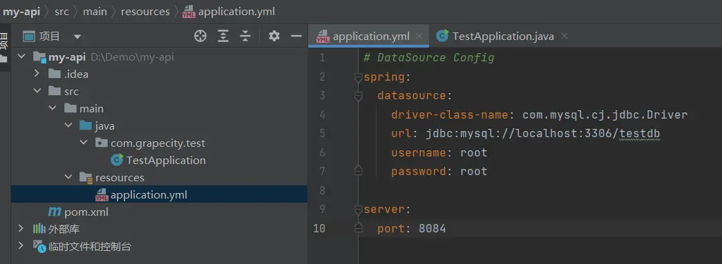 TestApplication.java是Springboot的入口文件,除了必要的引入外,還規定了要掃描的Mapper。