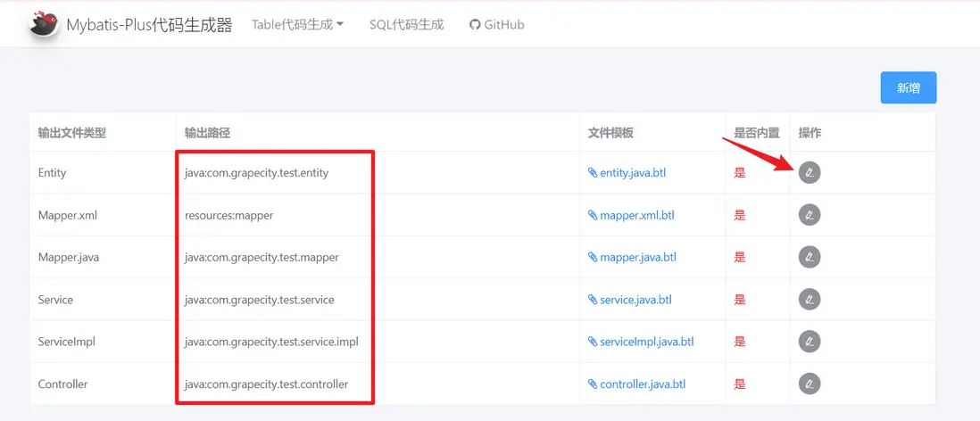 看到頁面上方的“代碼生成”按鈕了嗎,先別急着點它,咱們需要先配置一下生成的文件的包名是什麼,點擊上方的輸出配置: