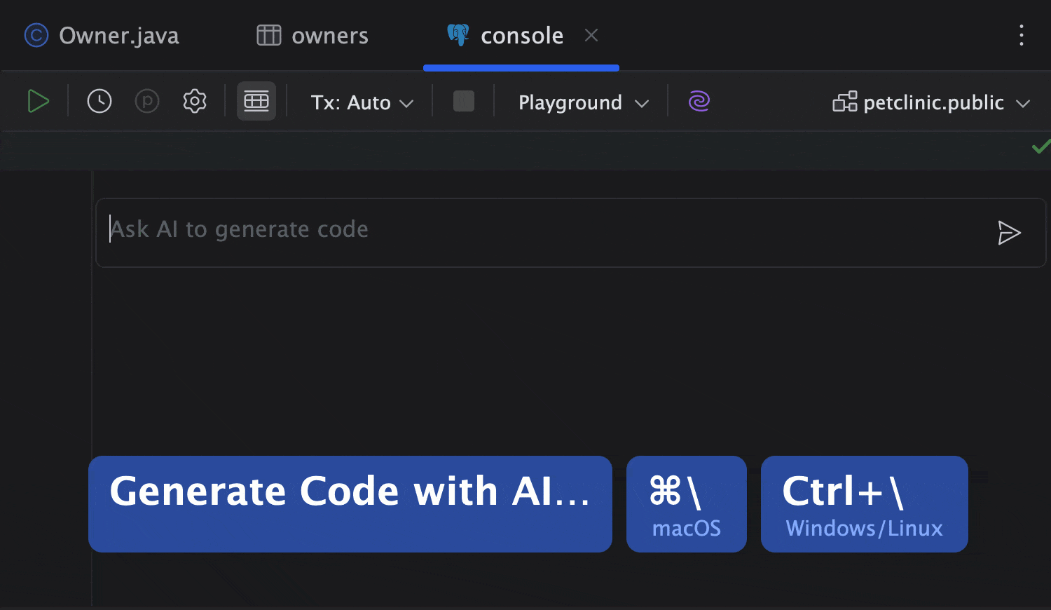 IntelliJ IDEA的AI助手可以直接在查詢控制枱中為您生成SQL查詢。在編輯區域按⌘\(macOS)或Ctrl+\(Windows/Linux)調用AI助手,輸入您想要的查詢描述,然後按Enter提交請求。