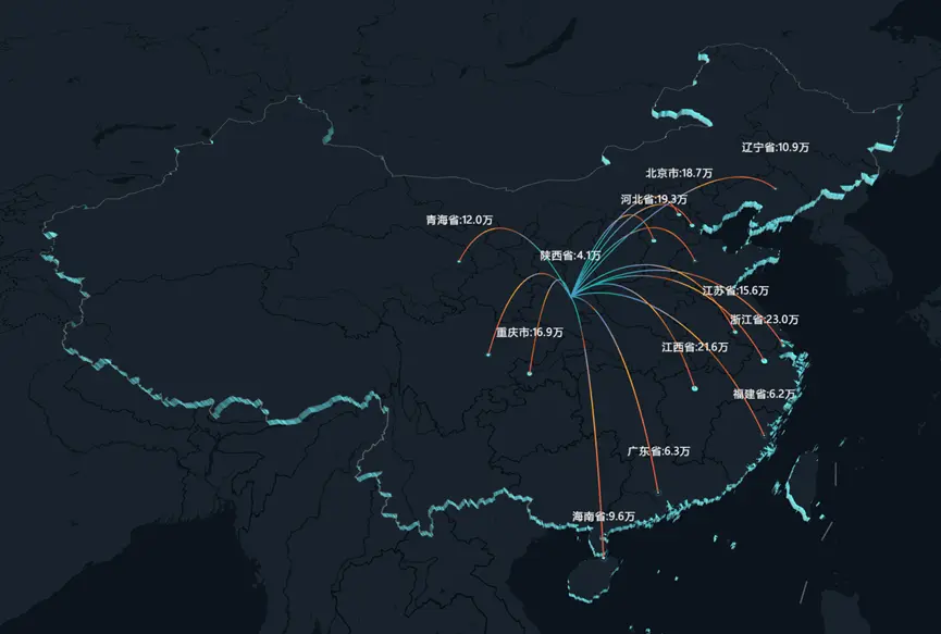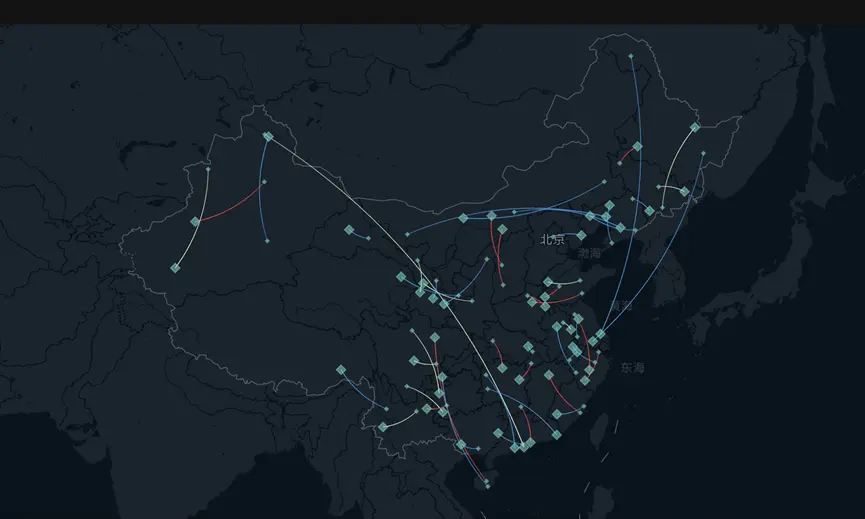飛線地圖是一種地圖可視化技術,通過使用線條來顯示航線或運輸路徑。它可以展示物流、航空運輸、航線網絡等信息。