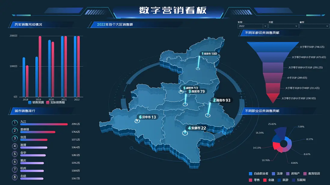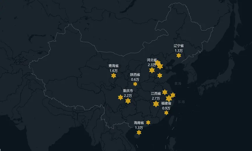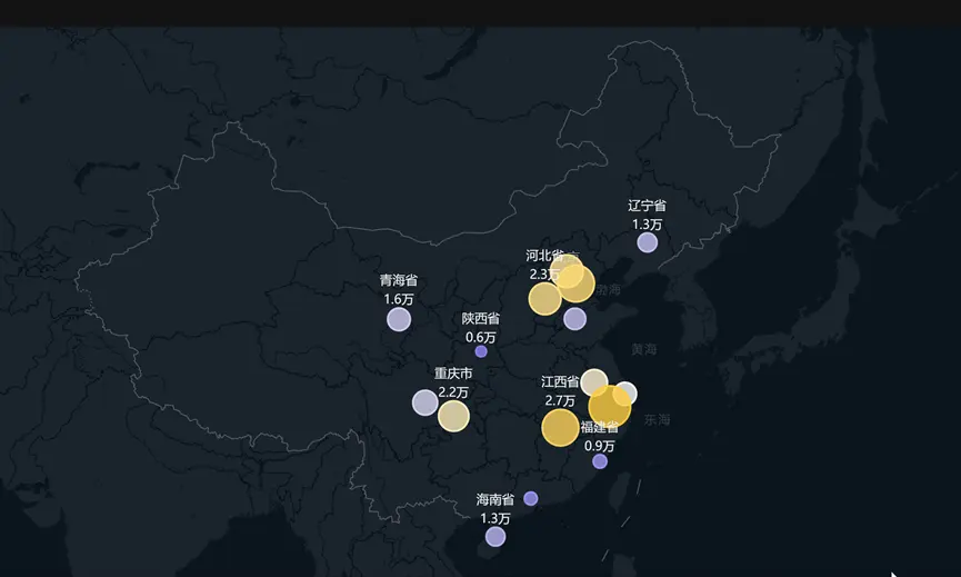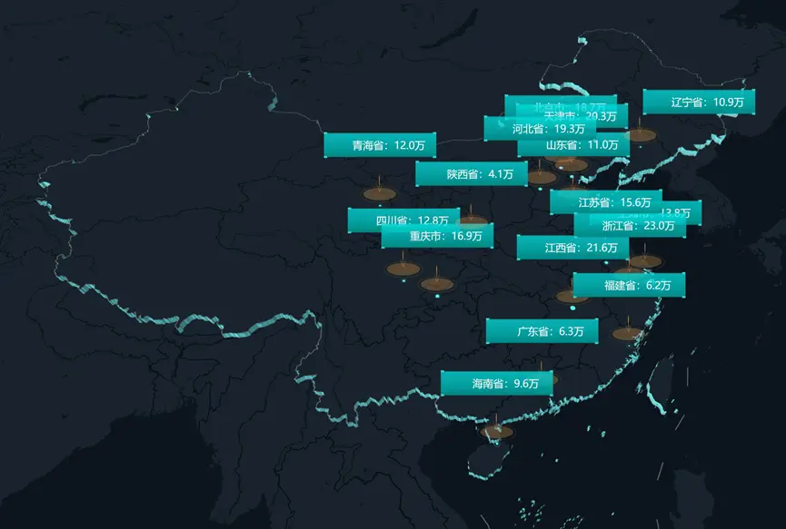某企業在全國範圍內銷售產品,為了更好地瞭解不同地區的銷售情況,他們使用了三維地圖柱形圖來展示數據。在地圖上,不同地區的柱形高度代表了該地區的銷售量。通過觀察柱形圖,企業可以直觀地瞭解到哪些地區的銷售情況較好,哪些地區的銷售需要加強。可以根據需求,設定所需要展示的區域。