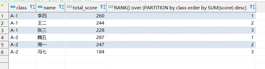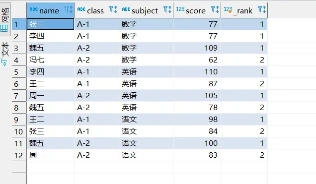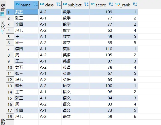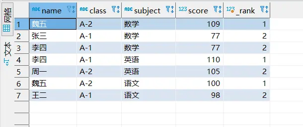 查詢每個班級中各個科目的前2名只需要在第一步(查詢本年級各個科目前2名的同學)的加上一個 class 班級的分區規則即可,查詢的結果如下圖所示: