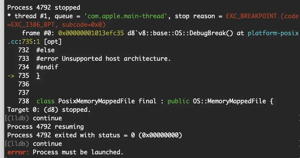lldb 中還存在許多其他的命令: 如 step, next, print 等,來執行單步調試、查看變量等操作。