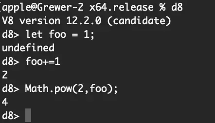 1. 執行指令 d8 , 之後可運行 js 代碼,就像 Chrome 的控制枱那樣: