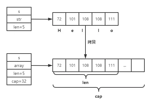 注意,輸出的cap可能與len不同,多出的容量處於對後續追加的性能考慮。