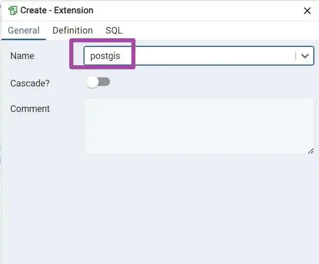 隨後,在彈出的Extension選擇窗口中,在Name後面的下拉框中找到postgis這個選項,如下圖所示——這裏也再一次驗證了,其實PostGIS就僅僅是PostgreSQL的一個拓展(Extension)。