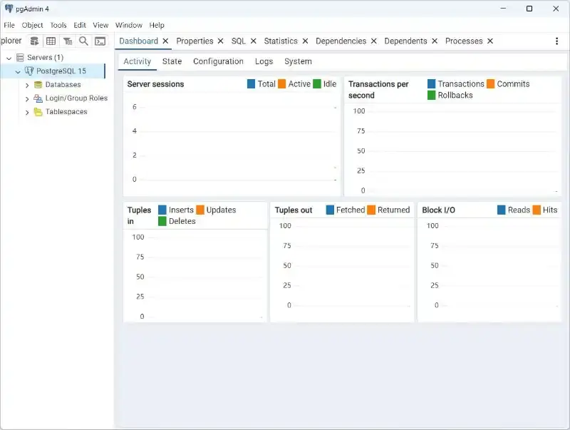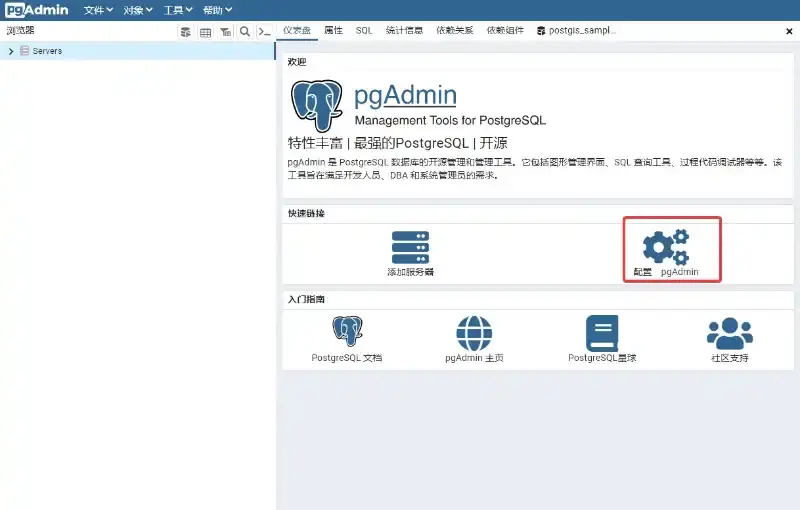 如果出現如下圖所示的界面,表明我們本機的PostgreSQL已經下載、安裝完畢,並且已經成功運行了PostgreSQL服務,且可以通過pgAdmin 4工具訪問本地的PostgreSQL數據庫了——在Windows下,PostgreSQL安裝完畢後默認自動啓動。