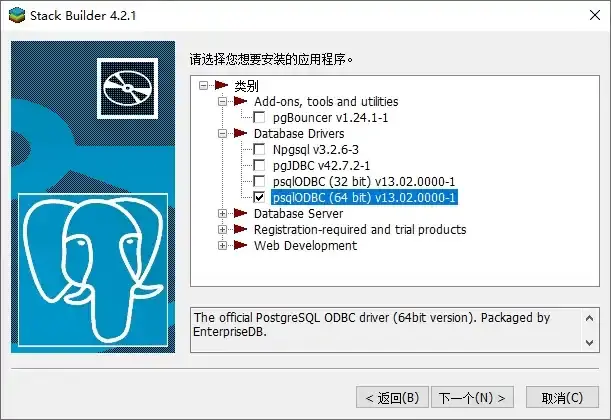 postgresql stack builder安裝odbc驅動(網絡很慢)/(可用我的離線包安裝,安裝在postgresql的目錄,可手動創建一個文件夾),記得勾選enable all GDAL Drivers