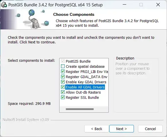 接下來,在安裝PostGIS時,又需要選擇一下安裝的項目,大家如果沒有別的特殊需求,按照下圖所示的勾選方式來安裝即可。