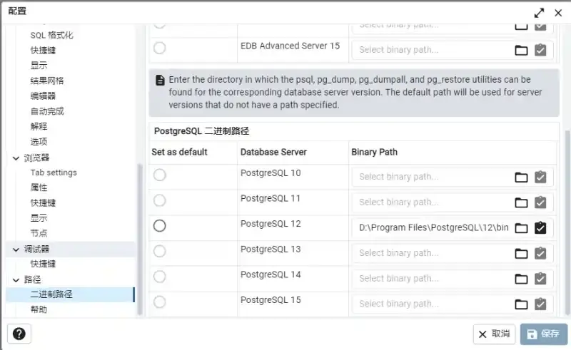 pgAdmin 配置 PostgreSQL 的命令行工具:設置二進制路徑
