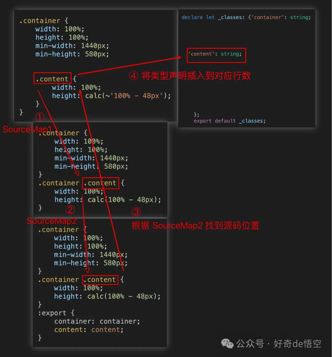 less 編譯 app.module.less 產生 SourceMap1,postcss 再次編譯產生 SourceMap2,再利用 SourceMap2 找到類名的源碼位置後,生成 d.ts 文件。