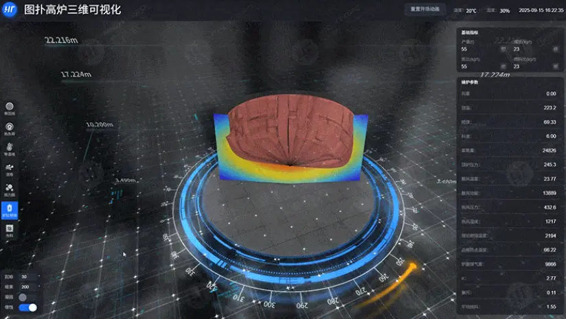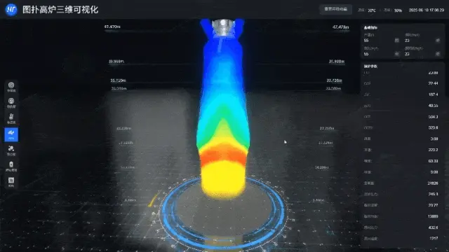 為實現爐內温度分佈的全域感知,圖撲以高爐實體尺寸為基準,1:1 還原搭建高爐三維模型,再將離散的測温數據通過插值算法進行空間插補,確保温度場呈現的連續性與完整性。並採用圖撲軟件自研的專屬熱力渲染引擎,將温度值映射為多色階漸變熱力圖。場景內支持對三維模型的任意角度旋轉查看,可從不同視角掌握爐內温度分佈細節。