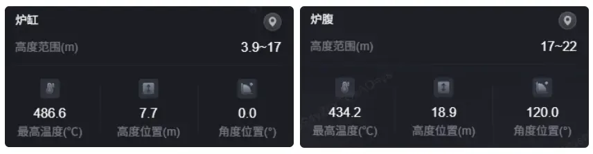 以爐缸侵蝕數據為核心、温度數據為輔助,結合爐缸實際結構參數構建,可直觀展示爐缸不同角度的侵蝕深度與對應區域的温度分佈情況,為判斷侵蝕風險、制定針對性防護方案提供數據依據。
