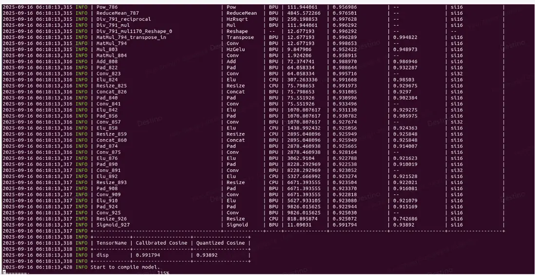 如圖 2,基於全 int16 算子配置量化,當前版本 resize 算子有約束(請查閲工具鏈算子支持情況),只能支持 int8 量化,即使配置了 int16,但算子依舊退化到 int8,因此算子的 cosine 相似度也比較低,基於此閾值,max\_qscale=6653/127=52.385,此 scale 過於大,並不能精細化量化模型,所以全 BPU 算子的整體精度都不高。