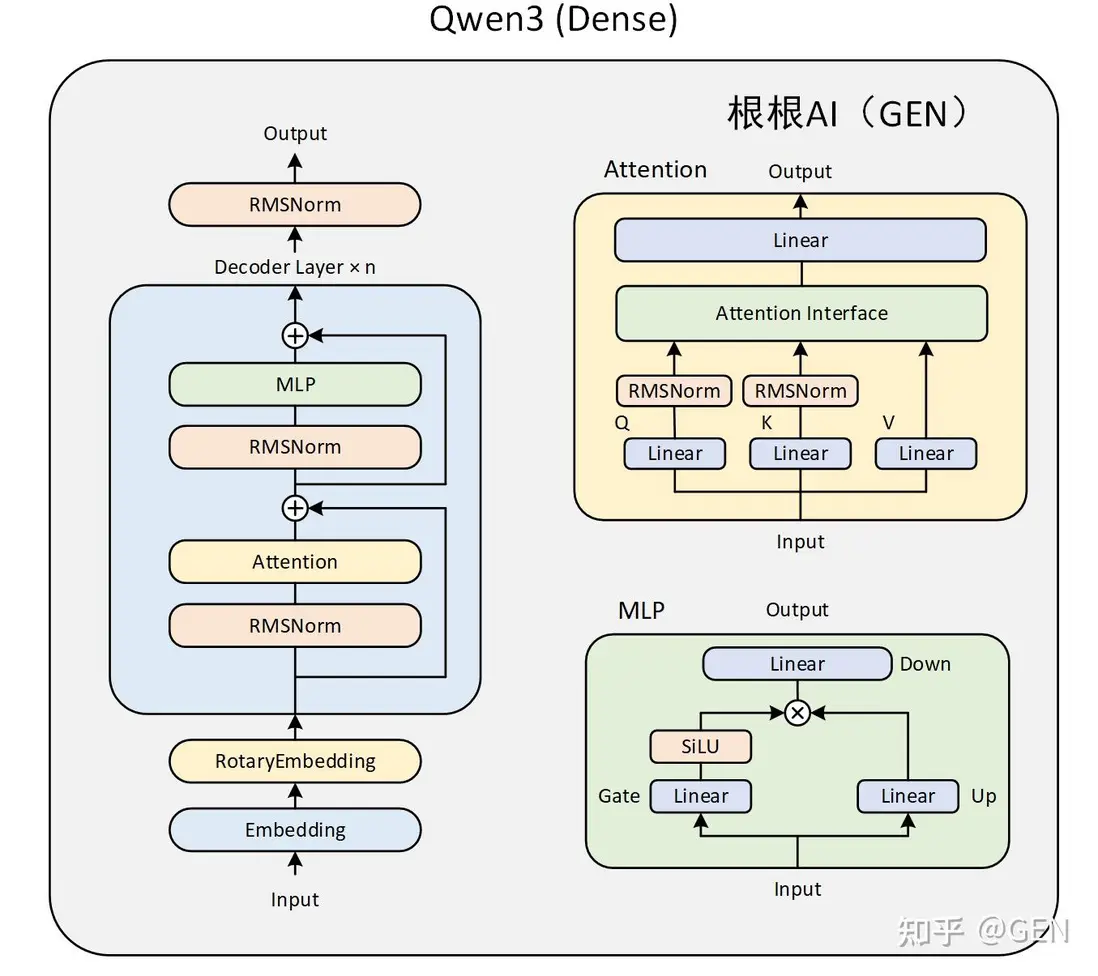 - Decoder layers:多個堆疊的解碼器。這是模型的核心計算引擎,負責理解輸入序列的上下文、提取特徵並進行深度信息處理。模型的能力(如理解、推理、生成)主要源於這些層。