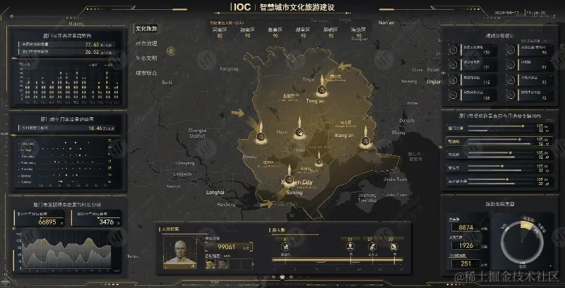 以廈門市景區為背景,在矢量 GIS 地圖上疊加範圍、標籤效果,將景點基本信息展示在地圖上,支持點擊景點查看實時遊客統計數據。