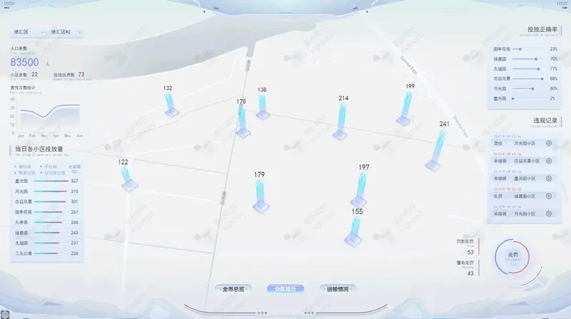 通過 Hightopo 自研引擎結合 GIS 實現上海市地圖的精確還原。GIS 引擎,能夠與 3D 場景準確同步。將上海市 16 個區的垃圾分類情況分別統計,有針對性地進行查看。2021 年下半年度上海全市 16 個區和 220 個街鎮的生活垃圾分類實效均達到“優秀”水平。各區中,嘉定區、楊浦區考評成績穩居前兩名。