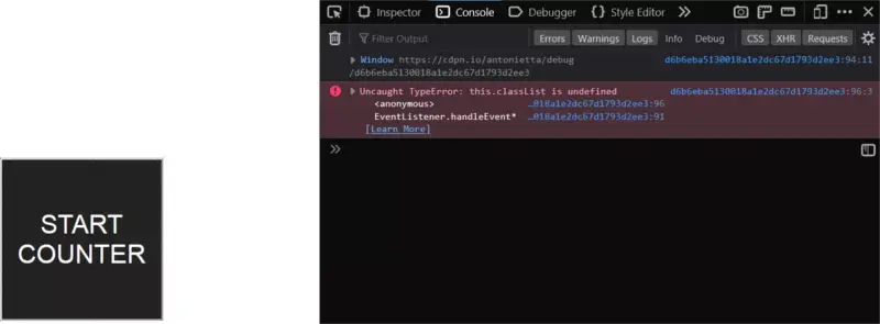 <span style="background-color:#292d3e"><span style="color:#bfc7d5"><code class="language-javascript"><span style="color:#89ddff"><</span>button class<span style="color:#89ddff">=</span><span style="color:#c3e88d">"start-btn"</span><span style="color:#89ddff">></span>Start Counter<span style="color:#89ddff"><</span><span style="color:#89ddff">/</span>button<span style="color:#89ddff">></span><span style="color:#89ddff">...</span>const startBtn <span style="color:#89ddff">=</span> <span style="color:#bfc7d5">document</span><span style="color:#c792ea">.</span><span style="color:#82aaff">querySelector</span><span style="color:#c792ea">(</span><span style="color:#c3e88d">".start-btn"</span><span style="color:#c792ea">)</span><span style="color:#c792ea">;</span>startBtn<span style="color:#c792ea">.</span><span style="color:#82aaff">addEventListener</span><span style="color:#c792ea">(</span><span style="color:#c3e88d">'click'</span><span style="color:#c792ea">,</span> function<span style="color:#c792ea">(</span><span style="color:#c792ea">)</span> <span style="color:#c792ea">{</span>