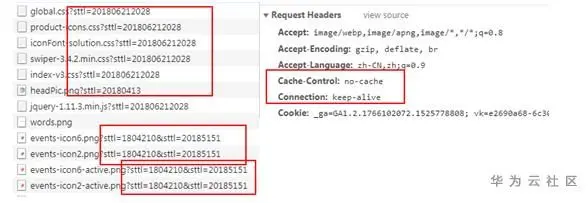 上圖描述的是可緩存文件的緩存策略。但是,網頁中還有很多文件,比如global.js、global.css等,更新頻率較快,如果一直使用本地緩存可能會影響頁面的正確性。因此,在引用這部分文件時,會在文件後添加個版本號,用以刷新緩存,以此確保本地資源的時效性,添加版本號的目的是為了強制要求文件每次加載重新向服務端請求。如下,左圖給出了部分文件的版本號後綴。這部分文件在瀏覽器重新加載後,請求報文的頭文件,Request Header的Cache-control值為no-cache,即無緩存,重新請求數據。如下右圖所示: