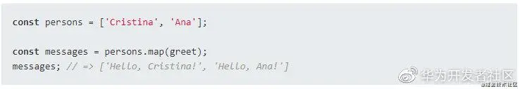 persons.map(greet) 獲取 persons 數組的所有元素,並分別用每個元素作為調用參數來調用 greet() 函數: `greet('Cristina'), greet('Ana')。